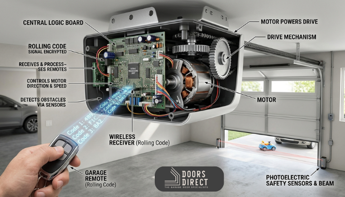 The logic board processes signals from remote controls, wall buttons, and safety sensors. Think of it like your phone’s processor, but for garage doors. It can control motor direction, speed, and when to stop based on limit switch positions.