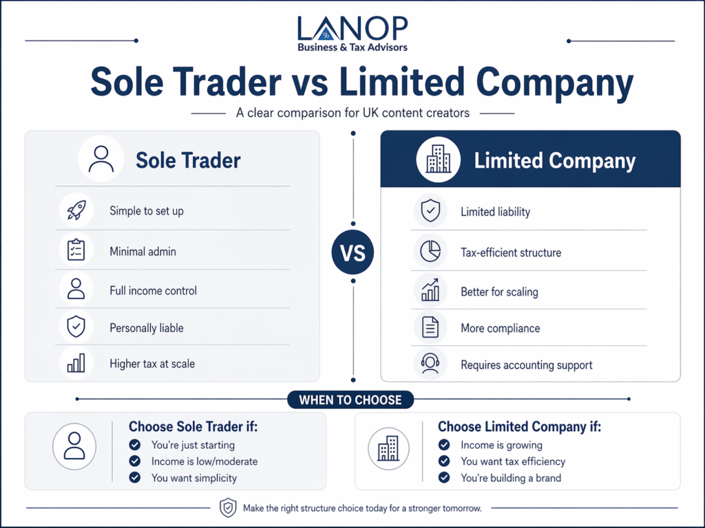 The decision between becoming a sole trader or forming a limited company is one of the most important choices a UK content creator will make. If you are just starting out with modest income, the simplicity of being a sole trader makes perfect sense. But as your brand and earnings grow, the tax efficiency and credibility of a limited company become harder to ignore.